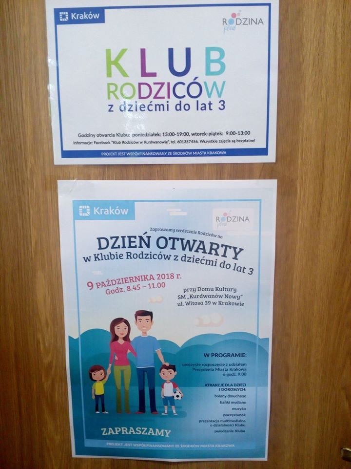 W dniu 9 października 2018 r. w Klubie Rodziców z dziećmi do lat 3 w uroczystym otwarciu Klubu uczestniczył Prezydent Miasta Krakowa - w prof. Jacek Majchrowski. Klub działa przy Domu Kultury SM Kurdwanów Nowy ul. Witosa 39 w Krakowie. Serdecznie zapraszamy. Zadanie jest finansowane ze środków Gminy Miejskiej Kraków.