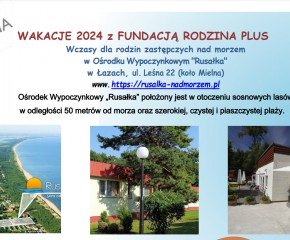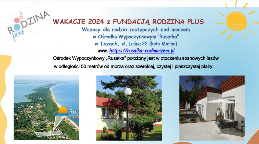 Zapraszamy serdecznie dzieci i ich rodziców/opiekunów zastępczych do wspólnego wypoczynku nad morzem podczas wakacji 2024 w Ośrodku Wypoczynkowym „Rusałka” w Łazach koło Mielna,