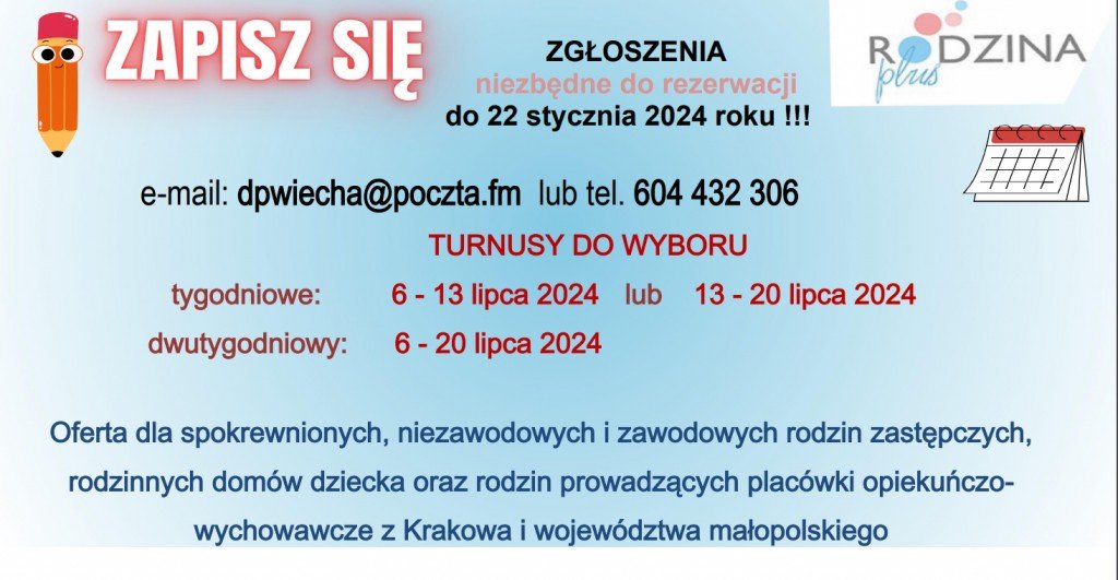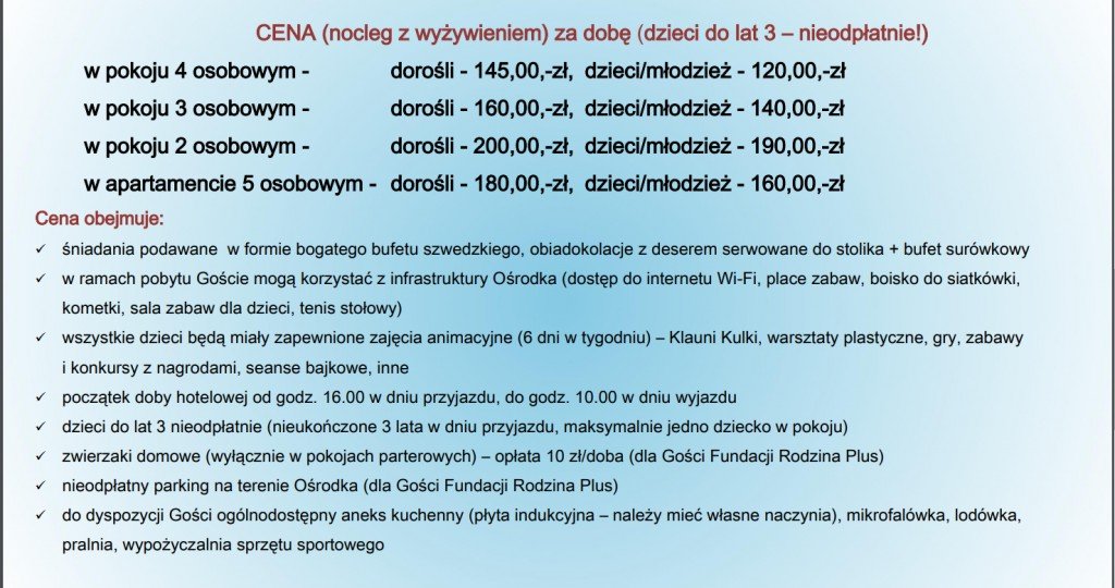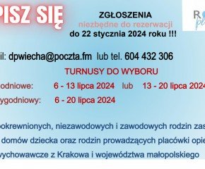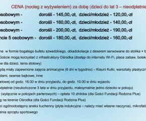 Podobnie jak w latach ubiegłych, mamy nadzieję na mile spędzony czas, wypoczynek i integrację środowiska rodzin zastępczych. Liczba miejsc jest ograniczona. Prosimy o pilną odpowiedź celem potwierdzenia rezerwacji grupy w Ośrodku „Rusałka” w Łazach.