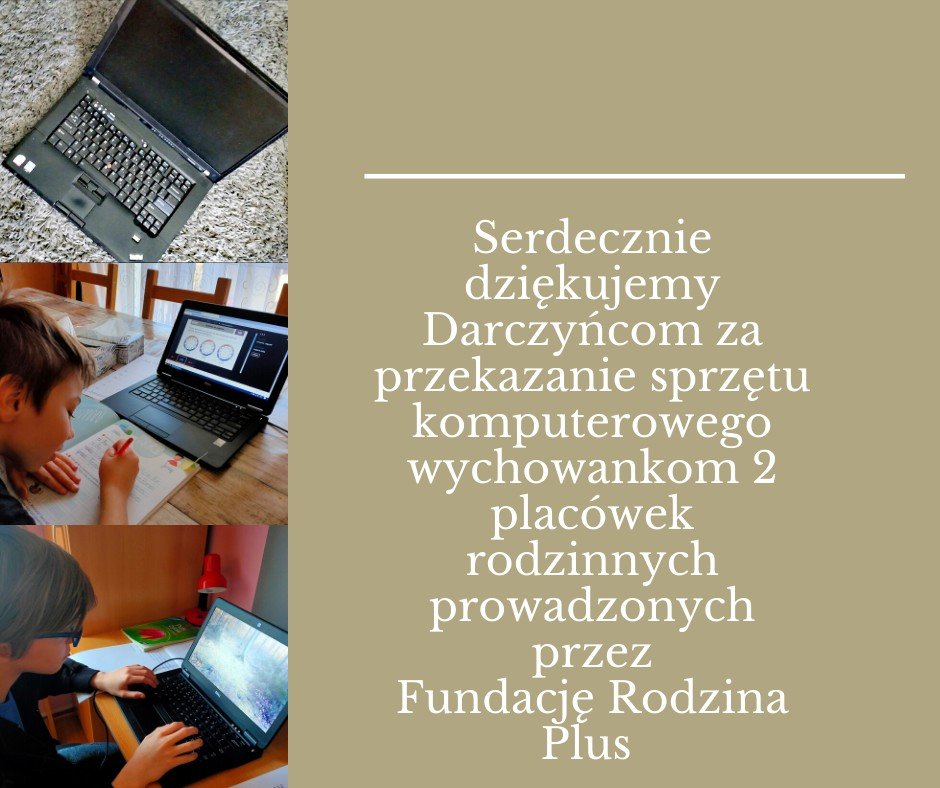 W tym dziwnym dla nas wszystkich czasie jesteśmy pewni jednego - warto wspierać i pomagać. W dwóch placówkach opiekuńczo-wychowawczych typu rodzinnego prowadzonych przez Fundację Rodzinę Plus – w marcu 2020 roku 11 wychowanków, często w tym samym czasie, potrzebowało skorzystać ze sprzętu komputerowego w ramach zdalnego nauczenia. Dzięki szybkiej akcji członków Zarządu Fundacji oraz Ani Sieńko – naszej dobrej duszy z Rady Fundacji, udało się za pośrednictwem firmy Salvis Expert oraz Pana Tomasza Żurowskiego, Dyrektora Regionalnego ds. Korporacyjnych ING BANK Śląski, pozyskać sprzęt komputerowy niezbędny do nauki online dla podopiecznych Fundacji.
